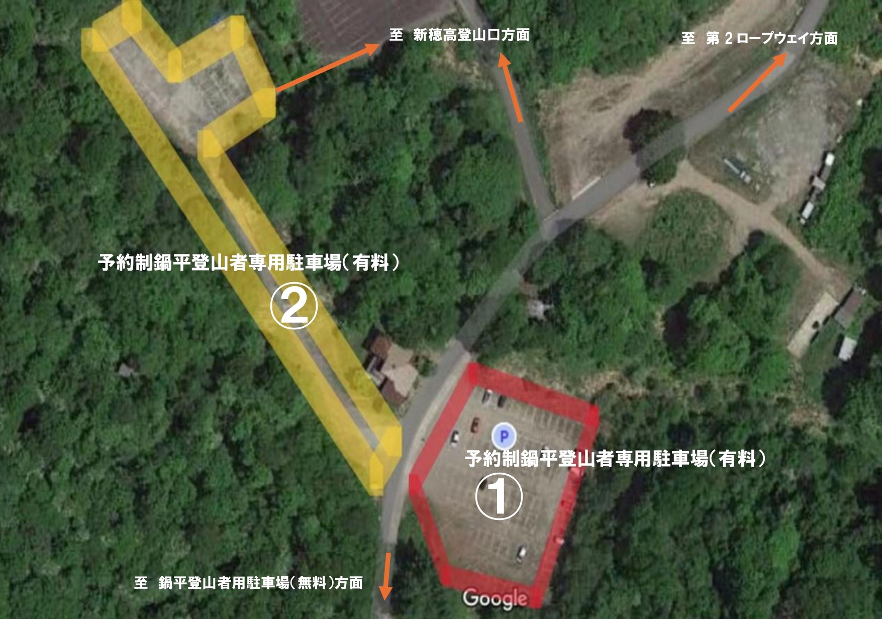 ⓵「予約制鍋平高原登山者専用駐車場①」の看板を目印に駐車場内へ進入してください。